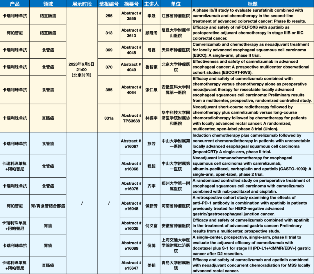 在消化道肿瘤领域,卡瑞利珠单抗和阿帕替尼共有13项研究入选(包括6项壁报展示和7项线上发表)。