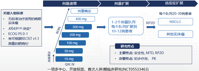 KRAS是肿瘤中突变最为广泛的癌基因之一,KRAS突变在胰腺癌、非小细胞肺癌和结直肠癌中最为常见。KRAS突变在肿瘤中的重要作用已经得到了广泛共识,但是长期以来,KRAS突变体被认为是一个难以靶向的靶点2。目前有两款针对KRASG12C突变的药物获批上市,但是KRAS不仅有G12C突变,还有G12D、G12V以及G13D突变等,临床需求远远没有被满足。在所有KRASG12D突变中3,以胰腺癌的突变发生率最高,其次为结直肠癌和非小细胞肺癌。靶向KRAS-G12D的药物在肿瘤治疗中拥有广阔的应用前景。该研究首次报告了HRS-4642在晚期KRASG12D突变实体瘤患者中进行的人体I期研究的剂量递增部分的初步结果。